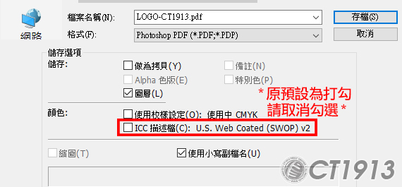 2. 在"格式"的選項選擇「Photoshop PDF」,並且將下方 "ICC描述檔(C)....." 的打勾取消掉,按ENTER鍵確認。