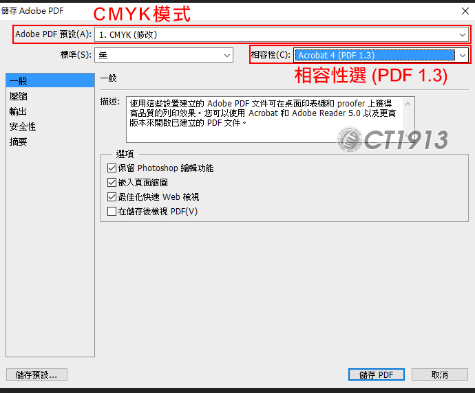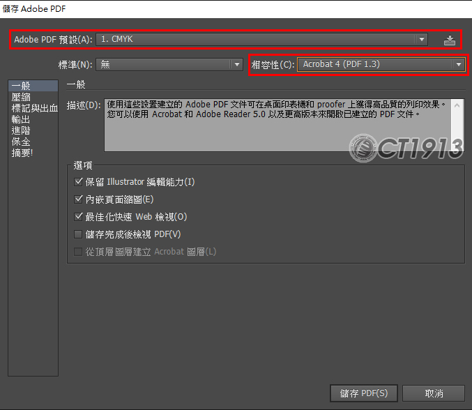 3. 在上方的"預設"選擇「CMYK」,右方的"相容性" 選擇「PDF 1.3」版本的,確認無誤後,按下儲存PDF。