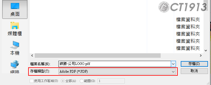 2. 在"存檔類型"選項選擇「Adobe PDF」,按ENTER鍵確認。