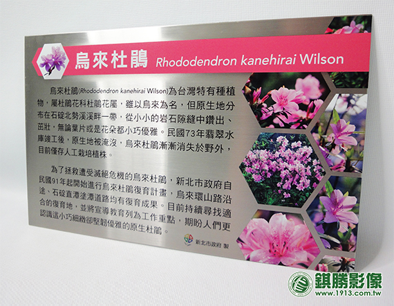 詳細說明:想要和旅客介紹家鄉的特色以及教育宣導,客戶選擇了2mm不銹鋼板來表現,並採用了數位UV彩印再加上局部白墨襯底來呈現花朵的鮮豔與美麗,圖面清晰且也不影響不鏽鋼本身的紋路喔!